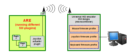 The Universal HID Actuator module is a USB dongle which acts as a mouse-, keyboard- and joystick-device on a remote system. Thus, no driver software is needed on Mac/Linux or Windows computers to allow for a control of these standard input devices. The control information (for example x/y mouse cursor position and clicking commands) are sent from the ARE (running on the Personal Platform or on a Laptop/Netbook computer) to the HID actuator dongle via a Bluetooth wireless connection or via a USB cable.